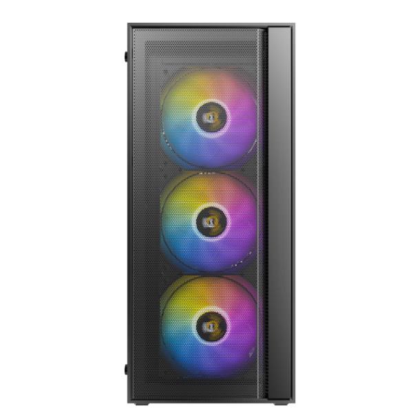 3. Ventole ARGB preinstallate: 3 ventole D12 ARGB 3-Pin (secondarie) da 120 mm nella parte anteriore e una ventola D12 ARGB 3-Pin (primaria) da 120 mm nella parte posteriore. L’illuminazione ARGB si sincronizza perfettamente con il software della scheda madre per un look unificato.
