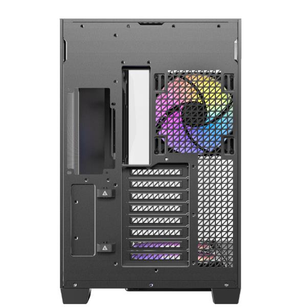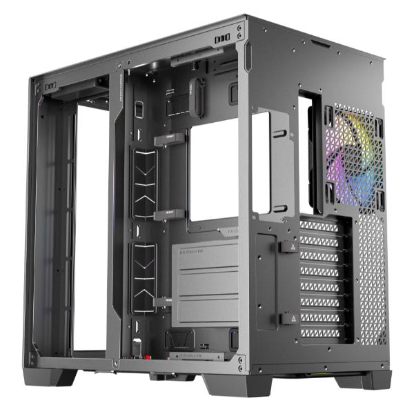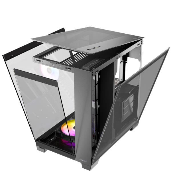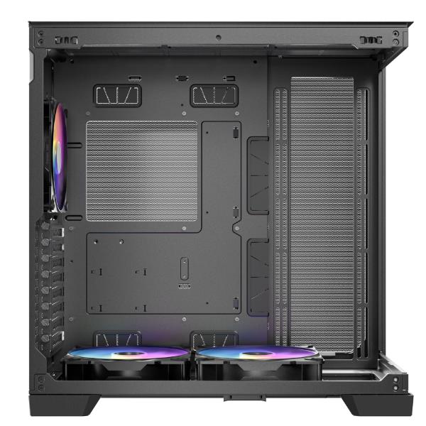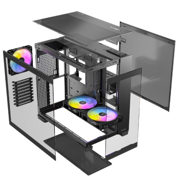 Il pannello frontale e quello sinistro utilizzano un’esclusiva tecnica di smussatura a 45° che rompe la barriera tra i due pezzi di vetro. Il bordo estremamente sottile della giunzione del vetro migliora l’esperienza visiva ininterrotta, panoramica e ultra-trasparente della vista a 270°, consentendo una vetrina completa dei componenti del PC di fascia alta e effetti di luce abbaglianti.