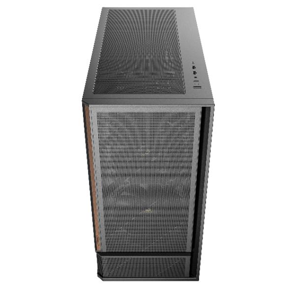 1. Pannello frontale con ampia rete metallica e dettagli in legno, caratterizzato da un design smussato al centro che combina prestazioni di raffreddamento ed estetica.