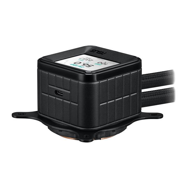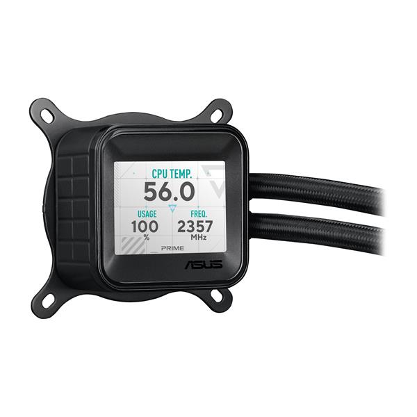 ASUS Prime LC ARGB LCD all-in-one CPU liquid cooler con schermo nitido che mostra le informazioni su CPU e GPU con diversi sfondi, pompa Asetek ad alte prestazioni dotata di un robusto motore, ventole collegabili in cascata