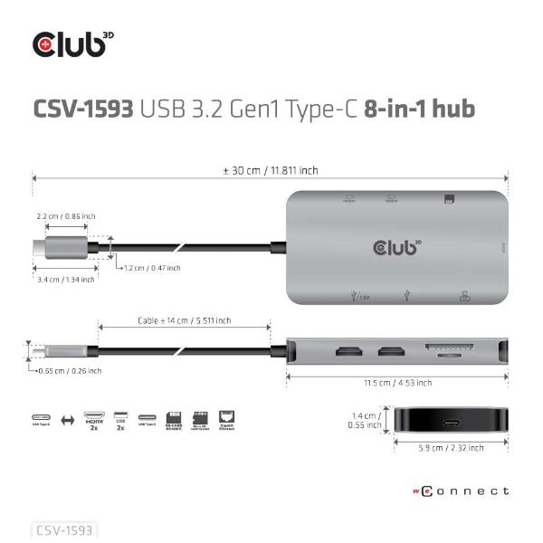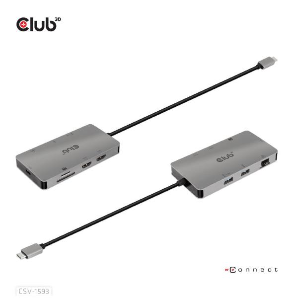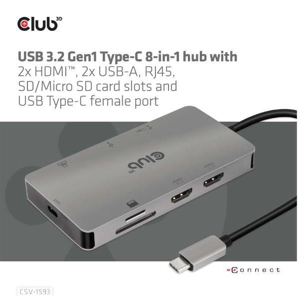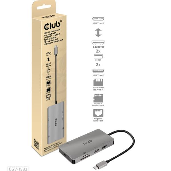 Hub USB-C Club3D 8-in-1 2xHDMI, 2xUSB-A, RJ45, SD/MicroSD e PD