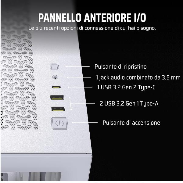 Il cabinet Corsair 3500X è la soluzione ideale per assemblare un PC potente e ben organizzato. Questo mid-tower in elegante colore bianco offre un’ampia compatibilità con i componenti moderni e una gestione dei cavi ottimale, garantendo un flusso d’aria eccellente per prestazioni stabili e un’estetica pulita.