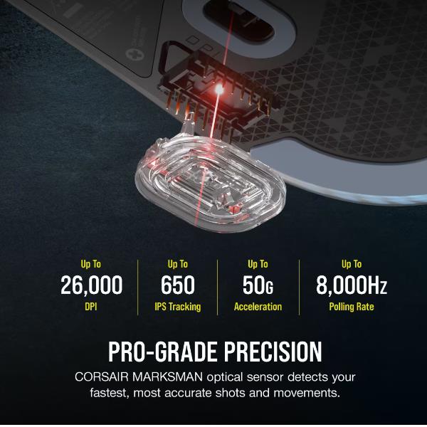 Il sensore ottico estremamente accurato CORSAIR MARKSMAN rileva ogni movimento con precisione millimetrica.