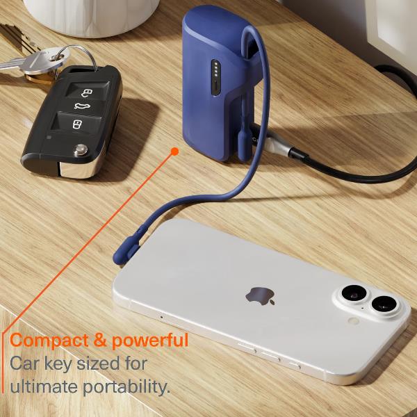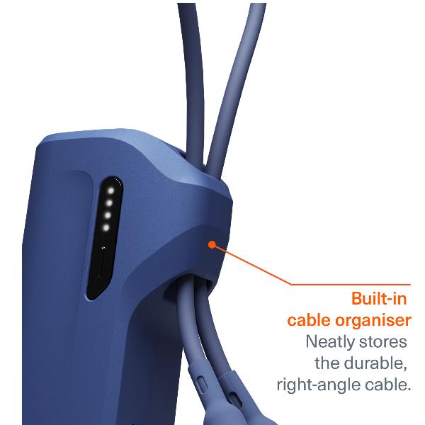 Questo mini Power Bank è dotato di un cavo in silicone ad angolo retto da 25 cm con un sistema di protezione dalla trazione avanzato e un organizer integrato, che mantiene tutto ciò di cui hai bisogno per una ricarica rapida ben riposto in tasca.