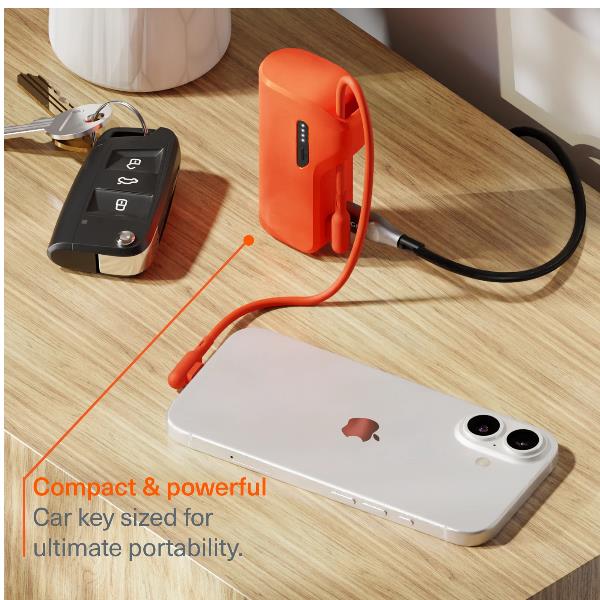Questo mini Power Bank è dotato di un cavo in silicone ad angolo retto da 25 cm con un sistema di protezione dalla trazione avanzato e un organizer integrato, che mantiene tutto ciò di cui hai bisogno per una ricarica rapida ben riposto in tasca.