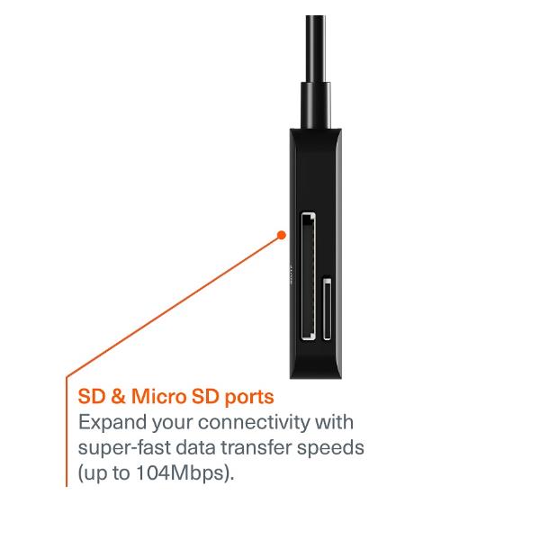 Collega due schede di memoria contemporaneamente al tuo dispositivo Type-C tramite le porte SD e microSD, semplificando il tuo flusso di lavoro.