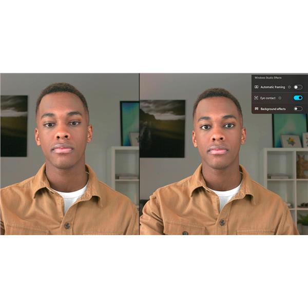 Gli effetti di Windows Studio con funzioni basate sull’intelligenza artificiale ti mantengono costantemente a fuoco con la sfocatura dello sfondo e l’inquadratura automatica e regolano lo sguardo per aiutarti a rimanere connesso con la funzione Eye Contact.