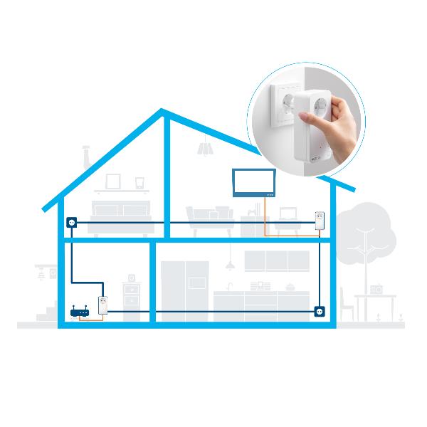Con la sua ampia copertura di 400 metri, l’adattatore Powerline con la nuova tecnologia G.hn include anche i locali che finora non erano dotati di accesso a internet.