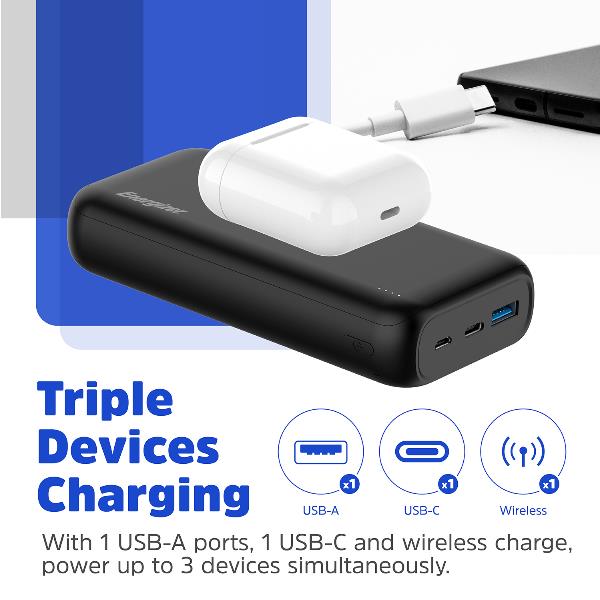 Hai mai contato i cavi che porti in giro? Con la power bank Energizer QE20009PQ, puoi finalmente lasciarne a casa qualcuno. Questa batteria portatile da 20.000mAh è progettata per essere l’unica fonte di energia di cui hai bisogno, per tutti i tuoi dispositivi.