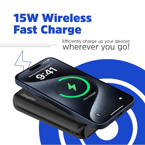 Power bank Energizer da 20000mAh con ricarica wireless integrata, la soluzione completa per mantenere i tuoi dispositivi sempre attivi. Offre una grande autonomia e la comodità di ricaricare smartphone compatibili senza cavi, ideale per viaggi e giornate intense fuori casa.