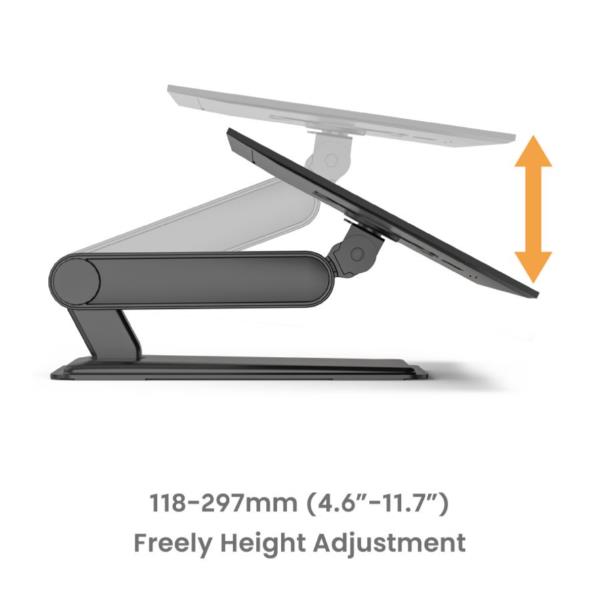 Il supporto presenta un design pieghevole e regolabile che consente agli utenti di modificare facilmente l’angolo di visione per un comodo utilizzo touch, per scrivere, disegnare o per le presentazioni. La sua base stabile garantisce un supporto affidabile durante gli input touch frequenti, riducendo al minimo il movimento dello schermo e migliorando il controllo da parte dell’utente. Quando non viene utilizzato, il supporto può essere ripiegato per essere riposto o trasportato comodamente, rendendolo particolarmente adatto ad ambienti di lavoro mobili o condivisi.