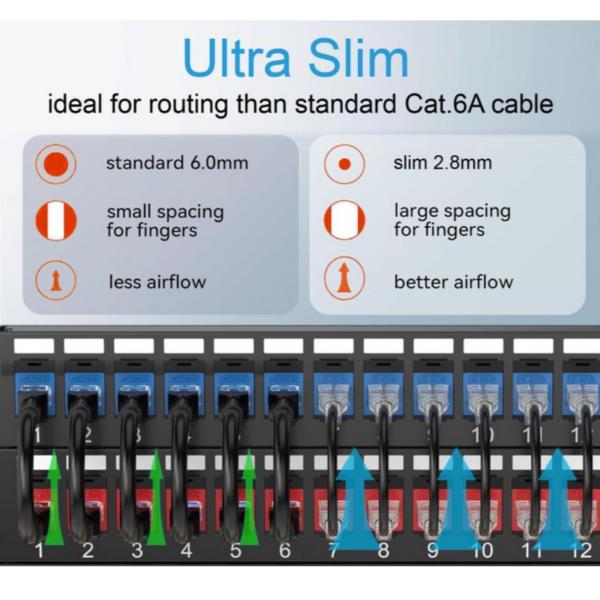 Il cavo patch Cat.6A U/UTP Slim è una soluzione di rete ad alte prestazioni progettata per i moderni data center, le reti aziendali e le installazioni ad alta densità. Caratterizzato da un design sottile e salvaspazio con un diametro ridotto (tipicamente intorno a 32AWG), questo cavo contribuisce a migliorare il flusso d’aria e la gestione dei cavi in rack o pannelli di permutazione affollati senza compromettere le prestazioni.