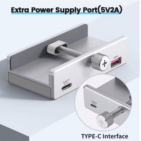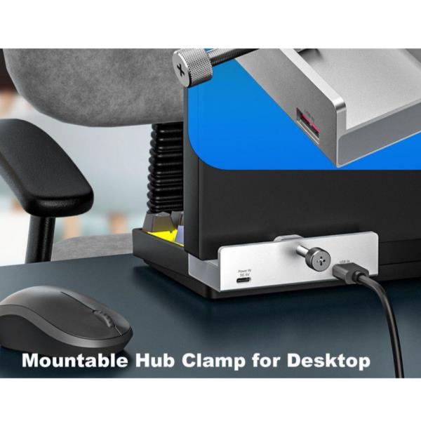 Il design del morsetto consente di fissare l’hub al monitor/al bordo della scrivania (larghezza massima 30 mm), clip regolabile