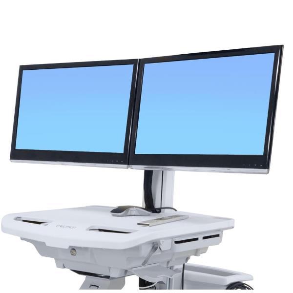 Consente al carrello medico di sostenere due monitor. Questo kit converte il carrello StyleView in modo che supporti due schermi. Il sistema di sollevamento presenta la possibilità di una regolazione dell’altezza di 13 cm, mentre la staffa a cerniera permette il movimento da un lato all’altro di uno qualsiasi degli schermi, per sistemare in avanti entrambi gli schermi o condividere una visualizzazione verso sinistra o destra.