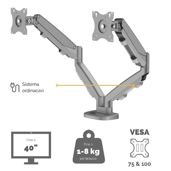 • Aumenta la tua produttività con due monitor – regge due schermi tra 1-8kg e 40” ciascuno