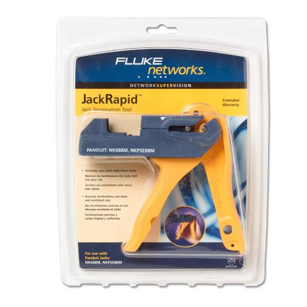 Lo strumento JackRapid Punch Down di Fluke Networks® JR-PAN-2 per Panduit NK688M e NKP5E88M. Consente di terminare i jack 8 volte più velocemente, fissando e terminando tutti i fili in una sola volta con una semplice pressione dell’impugnatura. La lama incorporata taglia il filo in eccesso, eliminando una seconda fase di rifinitura. Il semplice utilizzo con una sola mano riduce l’affaticamento della mano.