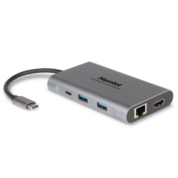 La Docking Station PD400D di Hamlet consente di ampliare l’area di lavoro dello schermo e la connettività del notebook utilizzando un solo cavo USB Type-C. Le due uscite video HDMI e DisplayPort con supporto 4K Ultra HD permettono di collegare due monitor esterni per duplicare o estendere il desktop del computer su schermi più grandi. Le tre porte USB 3.0 offrono connettività per dispositivi esterni come tastiere, mouse ed hard disk e supportano la ricarica di dispositivi come smartphone e tablet. Completa la connettività della docking station la porta di rete Gigabit per il collegamento alla rete LAN e Internet.