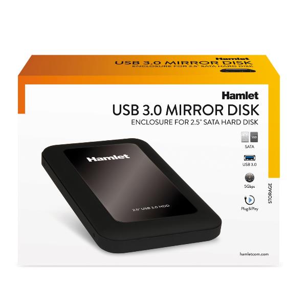 Hamlet USB 3.0 Mirror Disk è un box esterno disegnato per contenere Hard Disk SATA da 2,5" di qualsiasi capacità. Lo standard USB 3.0 è la nuova interfaccia ad alta velocità in grado di offrire una velocità di trasferimento dati fino a 5Gbps, 10 volte più veloce rispetto allo standard USB 2.0.?