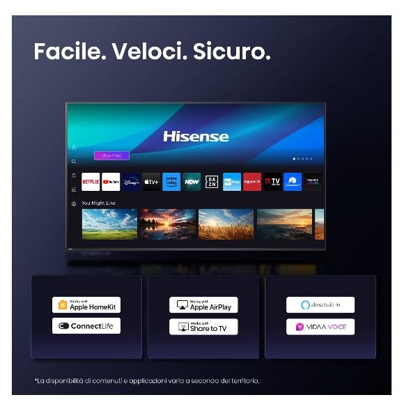 Film, programmi TV, sport, musica: l’intrattenimento che ami è ancora più bello quando lo ascolti su Hisense TV con DTS® Virtual:X™ e Dolby Audio. La sua chiarezza cristallina, i dialoghi facili da ascoltare, l’ottimo dettaglio e gli effetti sonori surround realistici si uniscono per aumentare l’impatto delle tue scene ed eventi preferiti.