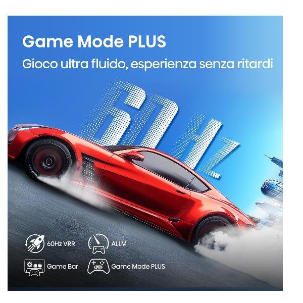 Migliora la tua esperienza di gioco con la modalità di gioco PLUS con una barra di gioco come centro di controllo integrato. VRR e ALLM riducono l’input lag ed eliminano lo screen strappo. Goditi il ??gameplay fluido su una TV a prezzi ragionevoli!