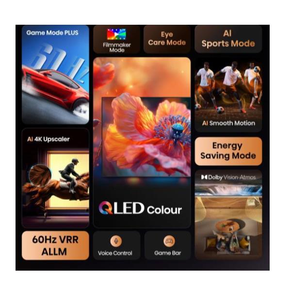 Per i giocatori, la Modalità Gioco PLUS con Barra dei Giochi integrata è un vero asso nella manica. Funzioni come VRR e ALLM riducono al minimo i ritardi di input e lo screen tearing, per una reattività che tenevi solo sul monitor del PC.