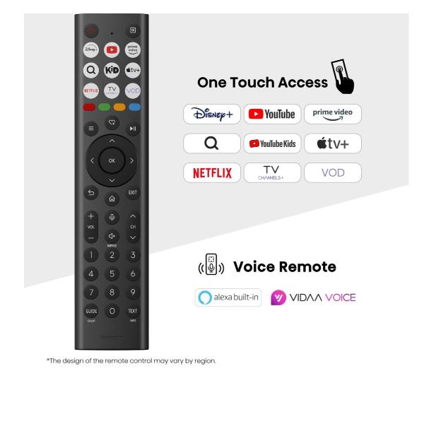 Il sistema operativo VIDAA organizza in modo intuitivo tutti i tuoi contenuti streaming e in broadcast. Il controllo vocale integrato nel telecomando ti permette di cercare titoli, regolare il volume e molto altro, semplicemente parlando. L’AI Light Sensor regola automaticamente la luminosità dello schermo in base alla luce della stanza, per il massimo comfort visivo e un risparmio energetico intelligente.