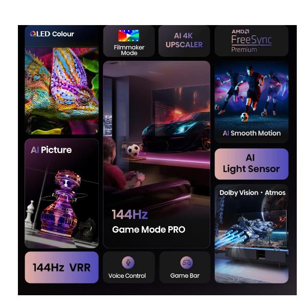 - AI Picture & AI Smooth Motion: Ottimizzano in tempo reale contrasto, colore e fluidità, eliminando le fastidiose sfocature nei movimenti rapidi, perfetto per sport e action movie.