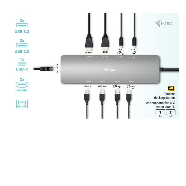 i-tec USB-C Metal Nano 2x Display Docking Station + Power Delivery 100 WPiccola docking station USB-C in metallo in grado di supportare fino a due monitor esterni contemporaneamente*. È sufficiente collegare il laptop o il tablet (non è necessario installare i driver) per beneficiare di un rapido trasferimento di dati USB e della connessione a Internet tramite una porta LAN. Naturalmente, la docking station è in grado di alimentare il laptop fino a 100 W, consentendo di ricaricare tutti i laptop e i tablet che supportano la ricarica tramite USB-C (USB-C Power Delivery).