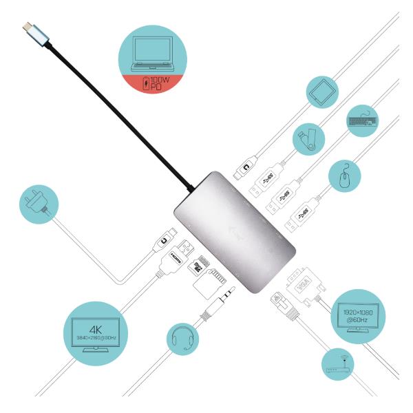 Una piccola docking station USB-C in metallo capace di collegare un monitor esterno o un proiettore per mezzo della porta HDMI o VGA. Basta semplicemente collegare il vostro notebook o tablet (non è necessario installare i driver) e avrete una rapida trasmissione dati via USB, un collegamento a Internet attraverso la porta LAN con la possibilità di collegare le vostre cuffie e il microfono. Naturalmente il dispositivo supporta l’alimentazione del vostro notebook, fino a 100 W, questo significa che potrete caricare i vostri notebook e tablet che supportano l’alimentazione tramite USB-C (USB-C Power Delivery).