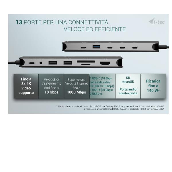 - Ricarica PD fino a 140W** per alimentare il tuo laptop mentre lavori, eliminando un ingombrante alimentatore.