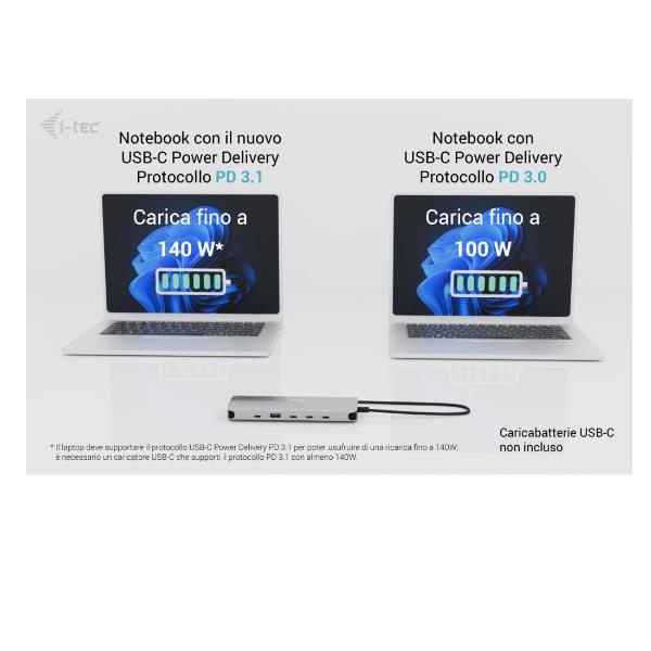 ** La potenza di ricarica effettiva (fino a 140W con PD 3.1) dipende dal protocollo supportato dal tuo dispositivo. L’alimentatore è venduto separatamente o in comodo bundle.