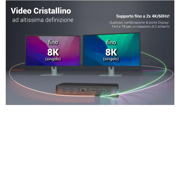 Collega fino a due monitor contemporaneamente e goditi una qualità d’immagine impeccabile, con il supporto per risoluzioni fino a 8K a 30Hz su un singolo schermo o 4K a 60Hz su due display. Perfetta per chi lavora con grafica, video editing o semplicemente desidera uno spazio visivo immenso.