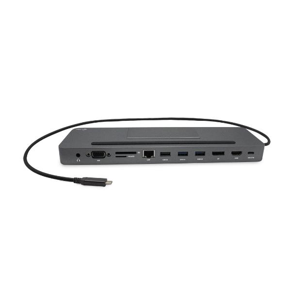 Un’ ergonomica docking station USB-C in metallo, la quale supporta fino a 3 monitor esterni. La station è compatibile con qualsiasi notebook munito di una porta USB-C o Thunderbolt 3 (il cavo di 60 cm integrato è abbastanza lungo per il collegamento di tutti i notebook con monitor entro 15“ di grandezza). Questa docking station offre 4 porte USB, una porta LAN integrata per una connessione rapida e affidabile alla rete aziendale e un’ alimentazione fino a 85 W.