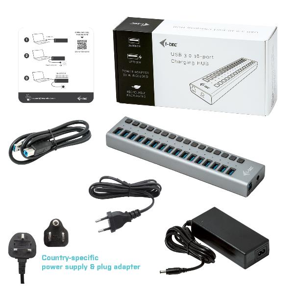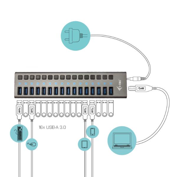 Hub USB I-Tec 16 Porte USB-A 3.0 con Alimentatore 90W