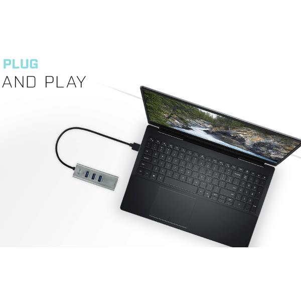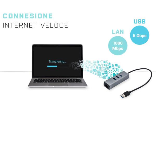 Non è solo un semplice hub: è una soluzione integrata che trasforma una singola porta USB-A del tuo computer in un centro di connessione completo. Ottieni tre porte USB 3.0 aggiuntive e una porta di rete Gigabit Ethernet, il tutto in un unico dispositivo dal design metallico resistente.