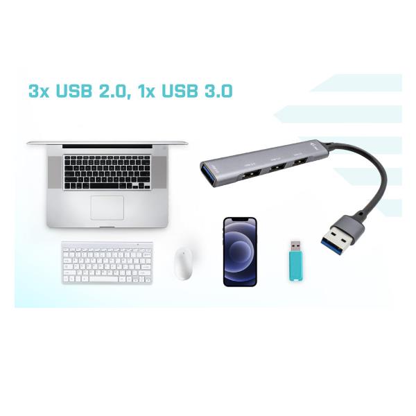 I portatili moderni hanno sempre meno porte USB. E se hai bisogno di collegare accessori al tuo dispositivo per i quali non hai più abbastanza porte, puoi usare questo piccolo ma pratico hub. Con questo hub, si ottengono 4 porte USB aggiuntive: una USB 3.0 standard e tre porte USB 2.0. Collega una tastiera e un mouse esterni, trasferisci dati o film da un’unità flash USB a velocità fino a 5 Gbps, o carica i tuoi dispositivi mobili (velocità USB standard 0.9A).