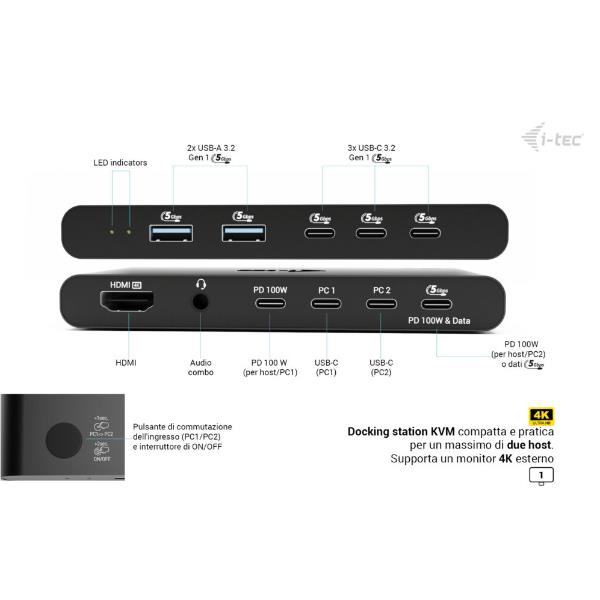 Docking station compatta e versatile con switch KVM integrato per un massimo di due host. Passa senza problemi da un computer all’altro e condividi un monitor, una tastiera, un mouse e gli accessori. Con il supporto per un display esterno 4K/60 Hz, doppia alimentazione (fino a 2× 100 W*) e un’ampia gamma di porte USB, questa docking station è la soluzione ideale per i professionisti che cercano efficienza, flessibilità e risparmio di spazio.
