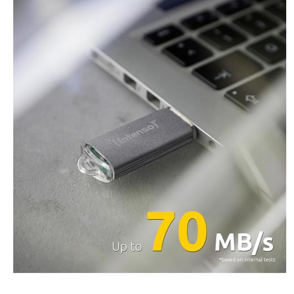 In Argento, alluminio, elegante: la chiavetta USB Intenso Jet Line convince grazie al suo aspetto pregiato e alla super velocità fino a 70 MB/s. A te la scelta: da un’ampia gamma di 32 GB fino all’impressionante capacità di 256 GB.