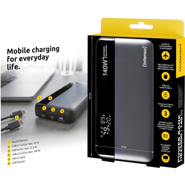 Gli Intenso Powerbank HE20000 e HE25000 consentono una ricarica extra veloce dei dispositivi compatibili. Grazie alle porte versatili, tra cui USB-A e due porte USB-C, puoi caricare in modo ottimale quasi tutti i dispositivi. Con il power bank HE20000 puoi caricare i tuoi dispositivi fino a 100 watt tramite la porta USB-C2. Grazie alla porta USB-C2 dotata di PD 3.1, supportata dal cavo USB-C a USB-C incluso con chip E-marker integrato, l’HE25000 raggiunge addirittura una potenza di uscita impressionante di 140 watt. Questo caricherà il tuo computer portatile in tempo record. Grazie alle diverse opzioni di uscita, i power bank si adattano alle tue specifiche esigenze di ricarica.