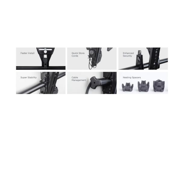 – Super Stabilitˆà garantita da viti aggiuntive che poste in corrispondenza dei montanti vesa che rendono l’installazione precisa e stabile per tutta la durata dell’installazione.