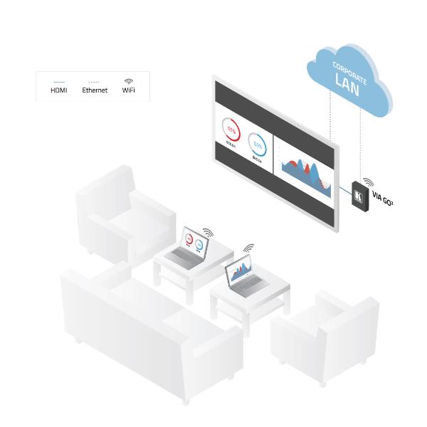 VIA GO² gives iOS, Android, Chromebook, PC, and Mac users instant wireless connectivity with 4K advanced presentation capabilities. The product features content streaming with crystal-clear mirrored images and stunning video playback and includes iOS mirroring via AirPlay™, Windows & Android mirroring via Miracast™, as well as ChromeBook mirroring. VIA GO² is super-compact (7x7cm) and flexible to install with both built-in Wi-Fi and LAN connectivity and includes industry-leading 1024-bit encryption for secure use on the internal network.