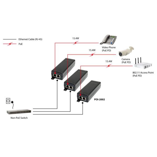 LevelOne POI-2002 è un iniettore Power over Ethernet che non solo fornisce una soluzione conveniente per la distribuzione dell’alimentazione, ma fornisce anche un modo continuo di implementazione sull’infrastruttura LAN esistente. È dotato di protezione da sovratensioni PoE 6KV e genera fino a 15,4 W ei dati provenienti da uno switch non PoE vengono uniti e quindi trasmessi ai prodotti conformi allo standard 802.3af come le telecamere dome PoE attraverso il cablaggio Ethernet. Quindi, preservando il tuo investimento nell’aggiornamento dell’hardware senza la necessità di acquistare switch PoE aggiuntivi. Inoltre, i dispositivi non PoE come i punti di accesso wireless possono anche essere accesi da remoto aggiungendo ulteriori splitter PoE, poiché alimentazione e dati sono ulteriormente suddivisi in due cavi, quindi questi dispositivi possono essere installati in aree difficili da raggiungere come i soffitti non ci sono prese o cavi elettrici nelle vicinanze.Caratteristiche principali- Elimina la necessità di un adattatore di alimentazione ingombrante e di una linea di alimentazione- Fornisce alimentazione e dati alle apparecchiature tramite un unico cavo Ethernet- Semplice installazione Plug and Play- Alimentazione remota fino a 100 m- Protezione contro le sovratensioni per aumentare la sicurezza- Caratteristica di interblocco unica per una facile installazione- Budget di alimentazione PoE totale: 15,4 W, fino a 15,4 W per porta- Livello di protezione contro le sovratensioni 6KV su ciascuna porta