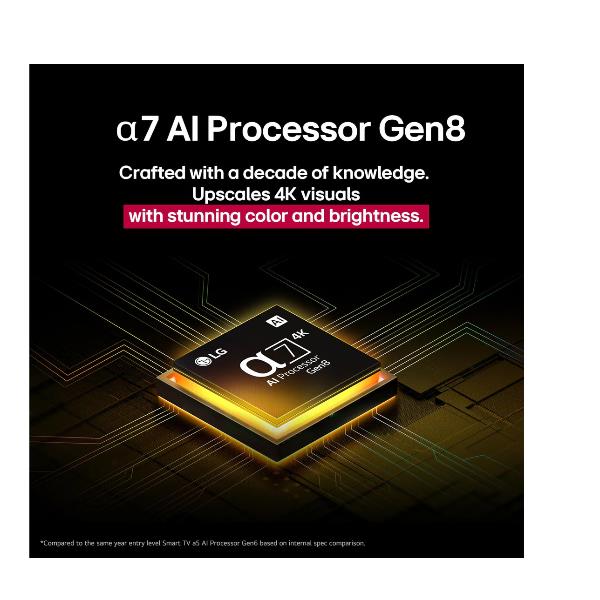 Il nuovo processore a7 Gen8 offre prestazioni superiori rispetto al modello precedente, grazie a una maggiore memoria e a una velocità di elaborazione più elevata. Utilizzando l’Intelligenza Artificiale, ottimizza i contenuti visualizzati sul TV con un’elaborazione accurata delle immagini e del suono. Trasforma i contenuti a risoluzione inferiore in 4K e rende l’audio più avvolgente con 9.1.2 canali virtuali.