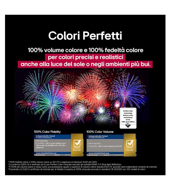 Questo TV è stato certificato da Intertek perché assicura una fedeltà cromatica al 100%, riproducendo colori realistici e autentici in ogni scenam, mantenendo intatti i dettagli originali. Inoltre, il volume colore al 100% consente di ottenere sfumature più ricche e intense, che donano profondità e vivacità, arricchendo ulteriormente l’esperienza visiva.