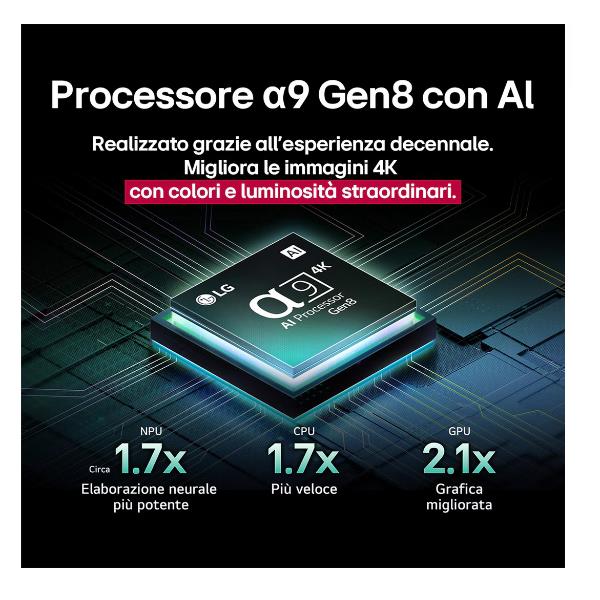 Il processore a9 sviluppato da LG è progettato per sfruttare al meglio la tecnologia OLED e darti un realismo incredibile. Giunto all’ottava generazione, questo processore conosce a fondo le caratteristiche del pannello e sfrutta gli algoritmi di deep-learning dell’Intelligenza Artificiale progressiva per riconoscere le scene di ciò che stai guardando e ottimizzare di conseguenza i contenuti, esaltando ciascun soggetto sulla scena.