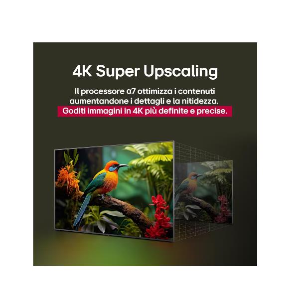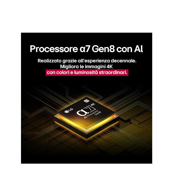 Il nuovo processore a7 Gen8 offre prestazioni superiori rispetto al modello precedente, grazie a una maggiore memoria e a una velocità di elaborazione più elevata. Utilizzando l’Intelligenza Artificiale, ottimizza i contenuti visualizzati sul TV con un’elaborazione accurata delle immagini e del suono. Trasforma i contenuti a risoluzione inferiore in 4K e rende l’audio più avvolgente con 9.1.2 canali virtuali.