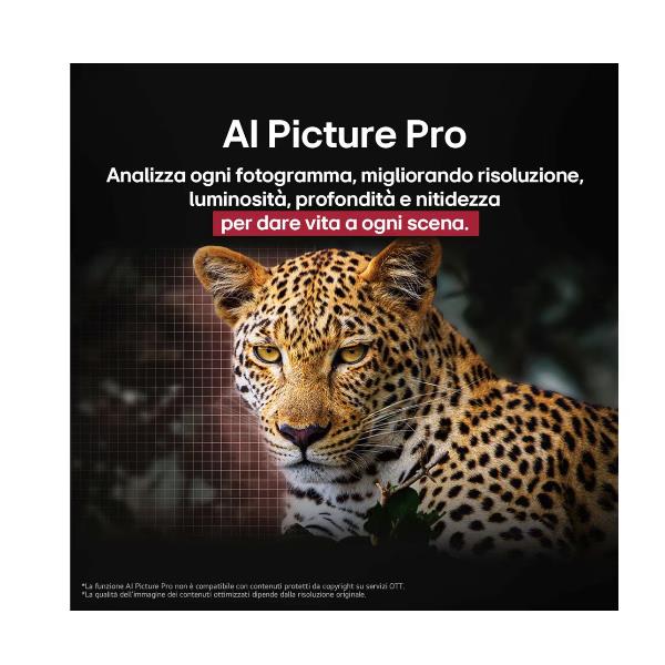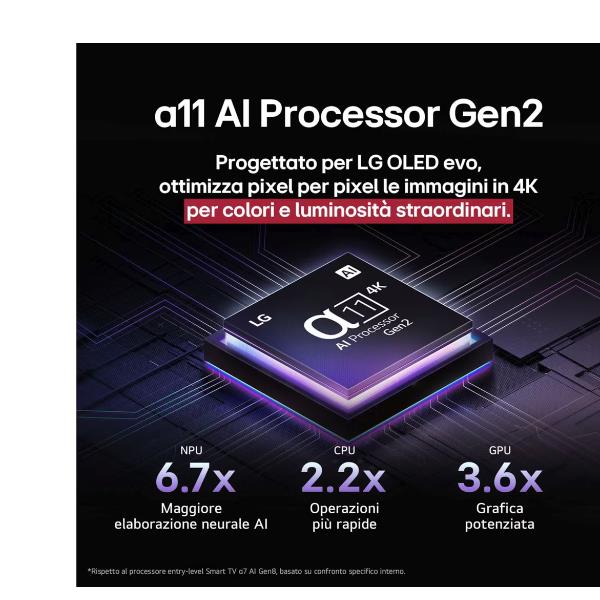 Il nuovo processore a11 gen2 con AI offre un’esperienza visiva straordinaria con qualità d’immagine 4K, arricchita da dettagli ottimizzati tramite l’Intelligenza Artificiale, che analizza in tempo reale ogni scena per esaltare la nitidezza e la profondità. Inoltre, grazie alla potenza del processore a11 gen2 con AI, il suono diventa altrettanto coinvolgente, garantendo un audio surround immersivo che completa perfettamente la visione, portando il tuo intrattenimento a un livello superiore.