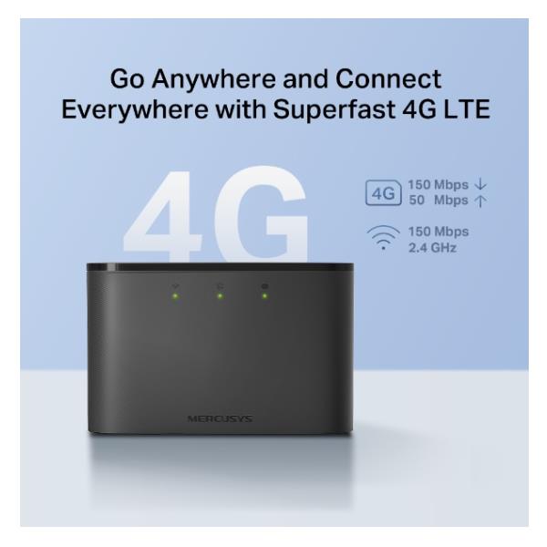150Mbps 4G LTE Mobile Wi-Fi, Build-In 150Mbps 4G LTE Modem, 150 Mbps at 2.4 GHz, 4G Cat4 150/50 Mbps, LTE-FDD/LTE-TDD/HSPA+/UMTS, MERCUSYS App, Build-In 2200 mAh Rechargeable Battery