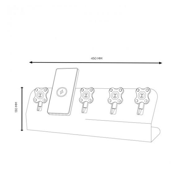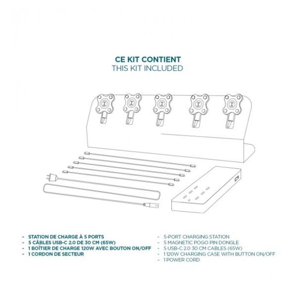 La stazione è dotata di 5 cavi USB-C da 30 cm ed è disponibile con spine UE, UK o US per la compatibilità internazionale. La sua struttura in PVC ultraresistente e i ricevitori POGO rimovibili la rendono una soluzione robusta, durevole e di facile manutenzione.