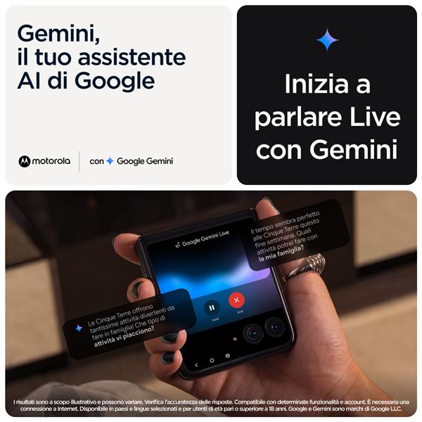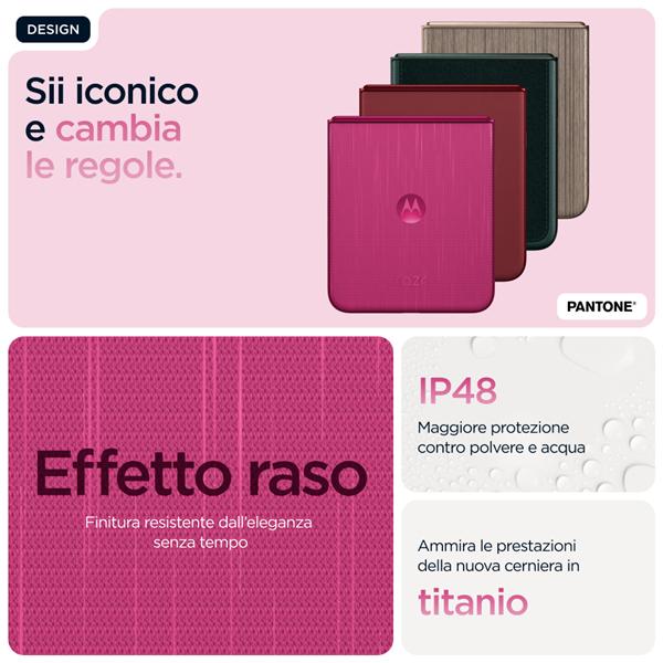 Scopri motorola razr 60 ultra, il massimo dell’innovazione. Con un design elegante e materiali pregiati come legno, alcantara e materiale premium vegano, unisce stile e funzionalità. Grazie alla tecnologia Moto AI, ogni interazione è intuitiva e personalizzata su entrambi gli schermi. La fotocamera da 50MP OIS + 50MP ultragrandangolare e macro cattura immagini straordinarie in ogni condizione e scatta selfie impeccabili con la fotocamera frontale da 50MP, mentre il display Super HD da 7" offre una visione nitida. Potente grazie al processore Snapdragon® 8 Elite, alla batteria da 4700mAh con ricarica rapida con 68W TurboPower™ e a 16GB di RAM e 512GB di memoria, garantisce prestazioni eccellenti. Un dispositivo all’avanguardia sotto ogni punto di vista.”